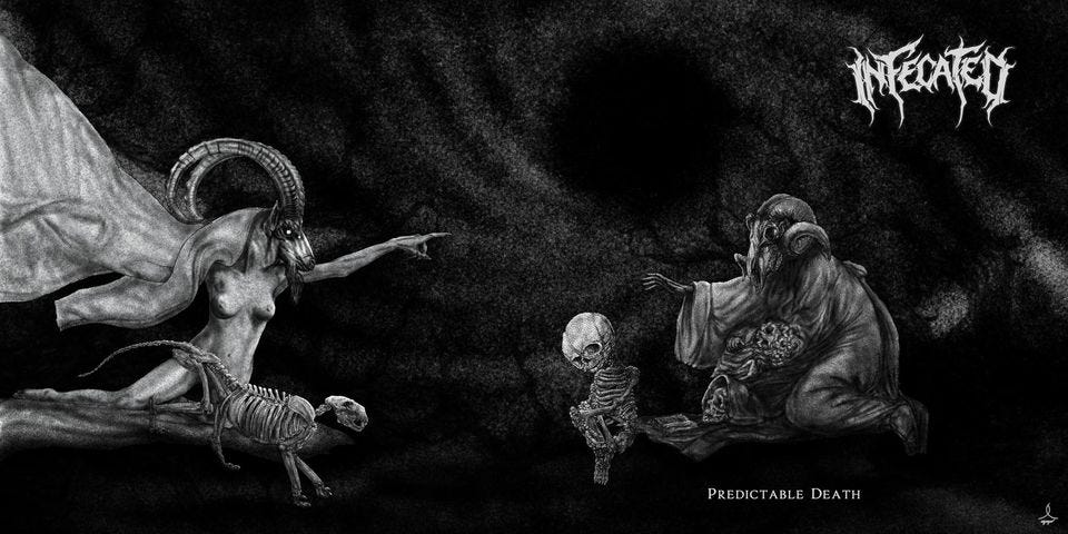 2. The artwork subtly hints at Michelangelo’s The Creation of Adam, albeit pulled from inside out to encapsulate what seems to be the “negative”, reverse version of such creation. How and how deep are the interplays between the artwork and Infecated’s compositions? How do real life happenings in turn affect the album as a whole, with some of its compositions dating as far back as 2019 (the split album with Taste)?